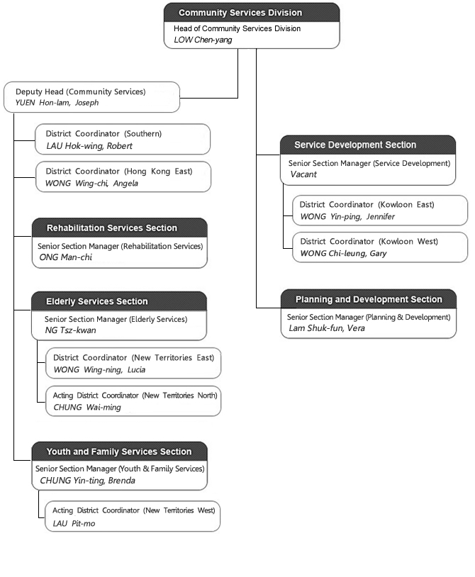 As at March 2025, Community Services Division has an establishment of 7,146 staff member (including both headquarter and service centres), in which there are 1,262 professional social workers, 709 nurses and 330 paramedical staff.